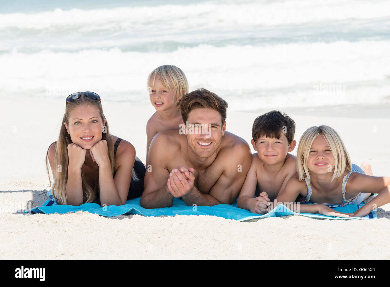 Ritratto di una famiglia felice sdraiato sulla spiaggia Foto stock - Alamy
